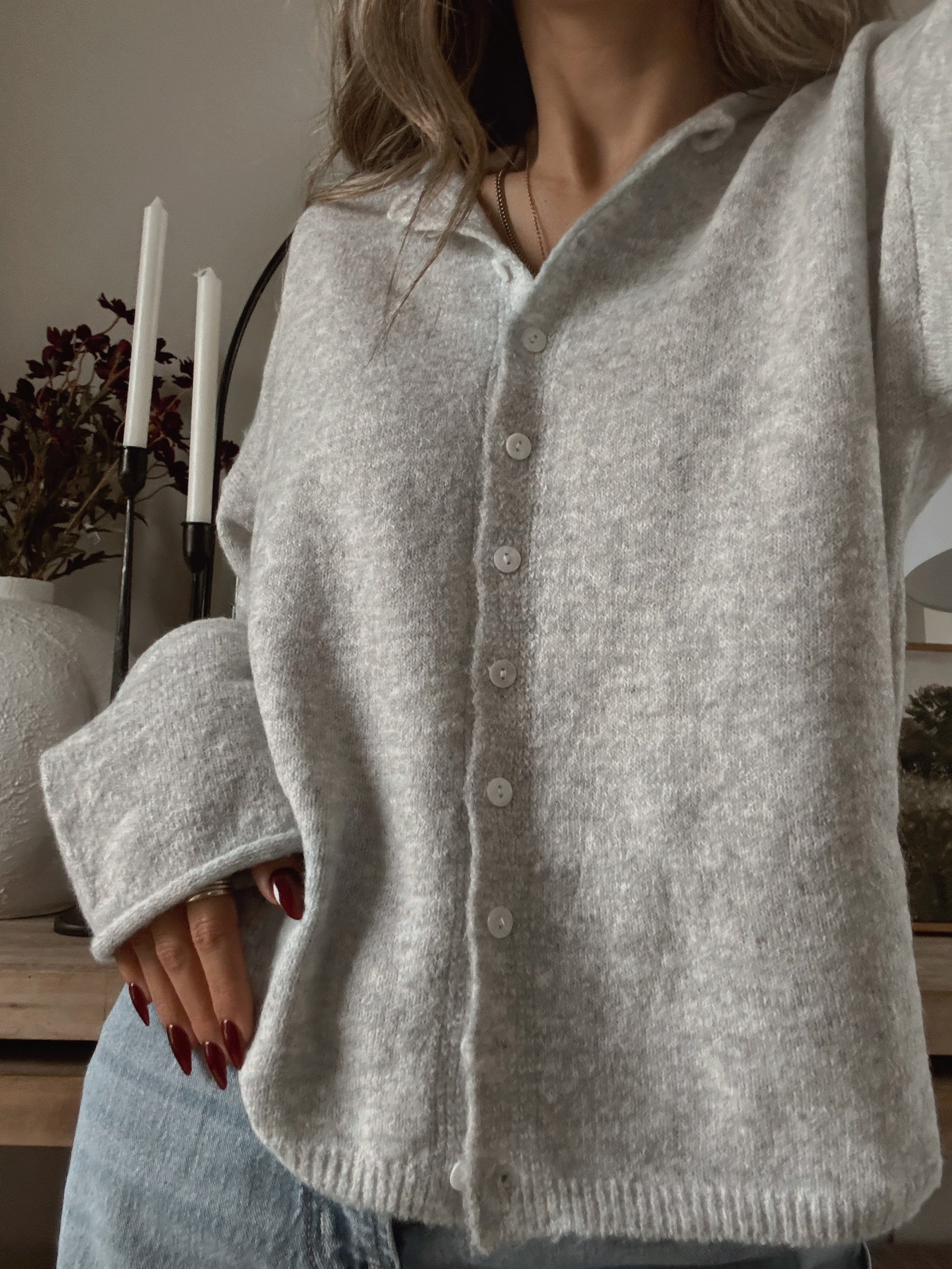 The perfect blend of classic and contemporary, this staple cardigan top features a rolled collar, button-down front, and long sleeves with dropped shoulders. Has a regular length, ribbed hem detail, and a lightweight, relaxed fit makes it versatile enough to wear on its own or as outerwear year-round. You'll want this in every color! 61%POLYESTER 15%ACRYLIC 15%NYLON 6%WOOL 3%SPANDEX