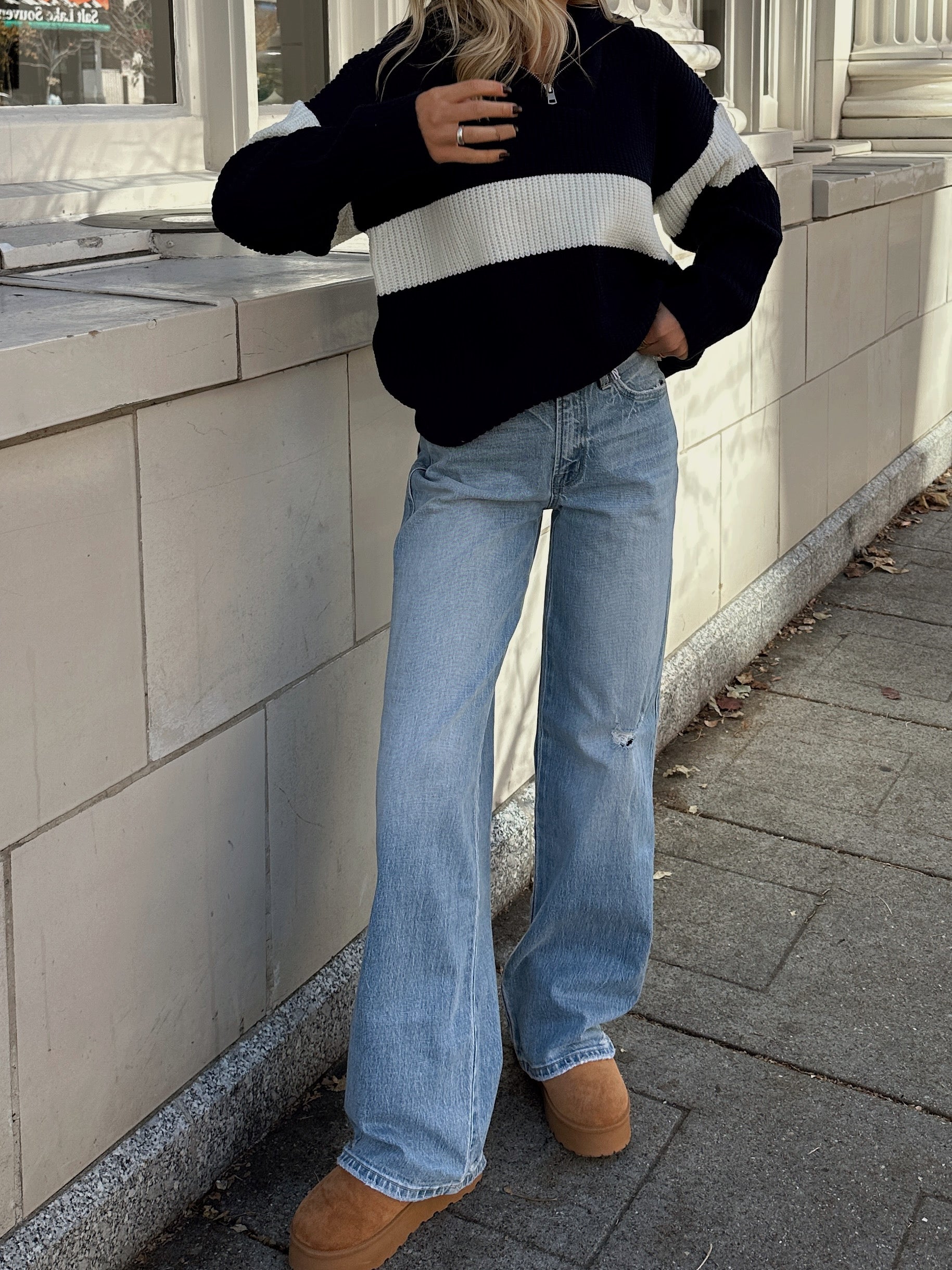 SUPER HIGH RISE BAGGY WIDE LEG JEANS COMFORT STRETCH DENIM, SUPER HIGH RISE WAIST, DISTRESSED DETAIL, FULL LENGTH, BAGGY WIDE LEG JEANS F. RISE: 11" / INSEAM: 33" / LEG OPENING: 22"